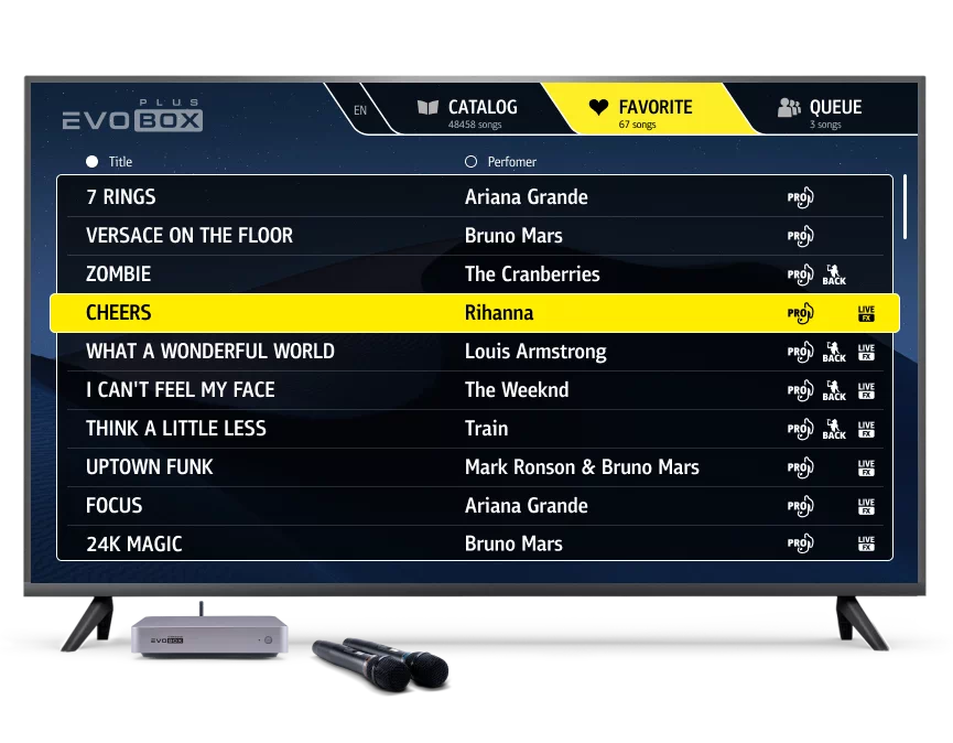 Looking for an extraordinary home karaoke experience? Then you need the EVOBOX Plus. 4K graphics, a huge catalogue with unique effects, studio quality audio recordings and two built-in digital microphones.
